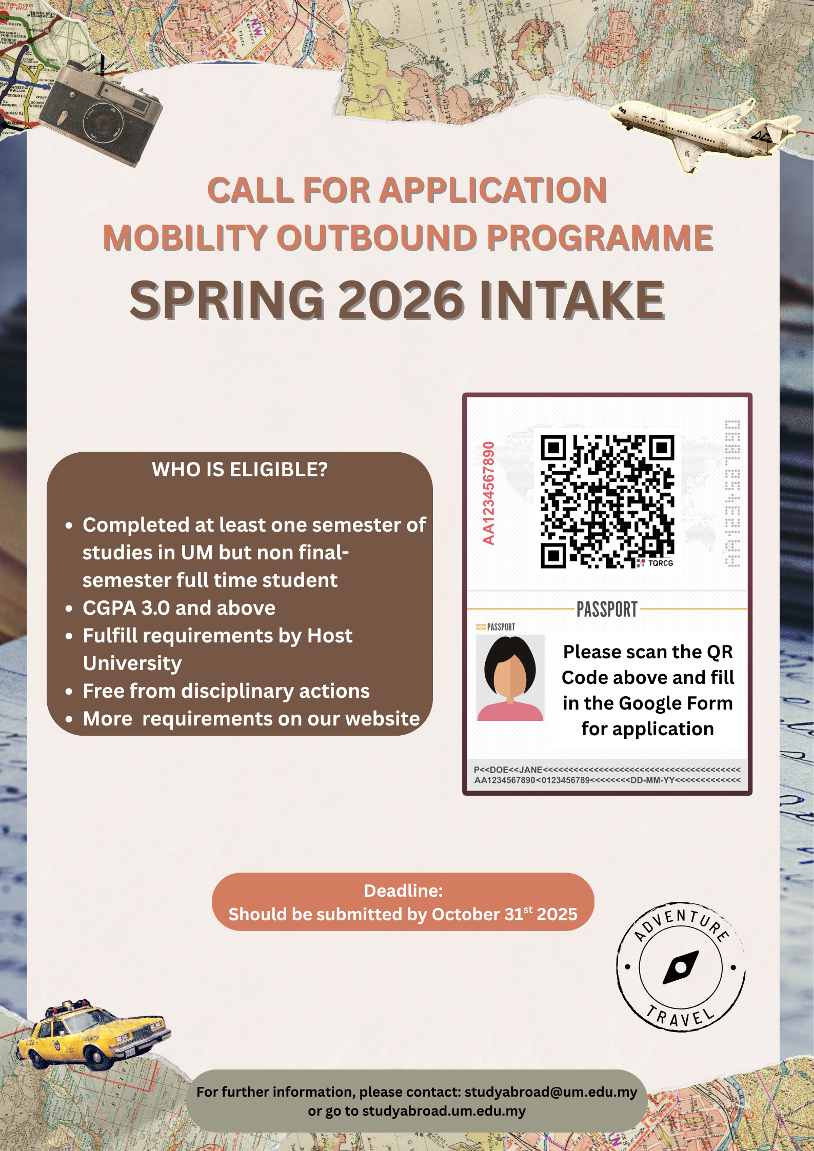 The Application Deadline for the Outbound Mobility Programme – Spring Semester is until 31th October.